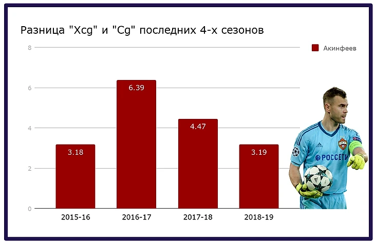Вообще сложно анализировать проблемы команды, не находясь внутри неё, но точно абсолютным бредом можно назвать всевозможные нападки «экспертов» в сторону Акинфеева. Игорь по-прежнему надёжен и выступает на своём высоком уровне и в текущем году. По одному из самых очевидных критериев надёжности игры на линии, разнице вероятно («Xcg») и реально («Cg») пропущенных голов, вратарь ЦСКА последних лет крайне эффективен, что подтверждается и в текущем сезоне.