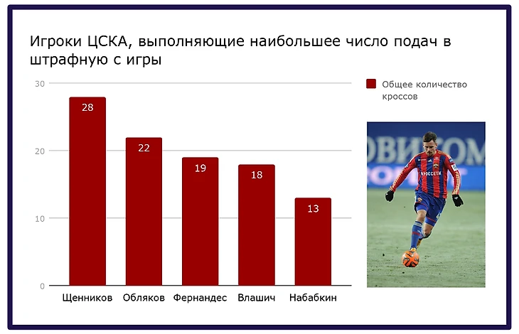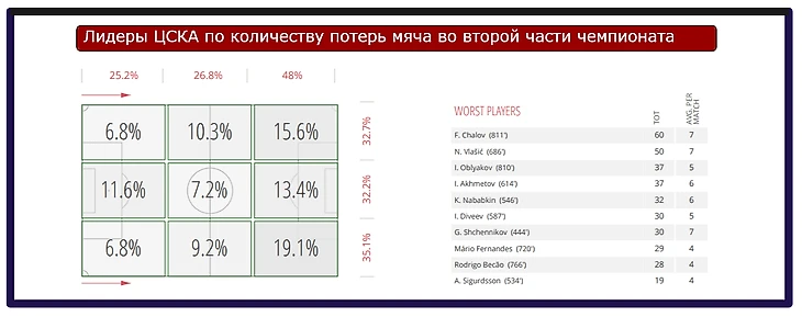 Вследствие большого количества брака в средней линии и долгих розыгрышей мяча с подключением центральных защитников, мяч практически перестал попадать в места, максимально удобные для Фёдора Чалова. Молодой форвард ЦСКА прекрасно открывается (смотреть выше разбор эпизода с передачей назад Облякова), и хорош в быстром розыгрыше, однако в большинстве матчей второй части чемпионата лучший бомбардир РПЛ оставался либо без мяча, либо получал его в отсутствии партнёра для стеночки. С учётом того, что Фёдор с большим отрывом лидер РПЛ по общему числу касаний в штрафной соперников, сложно представить, сколько ЦСКА потерял в атакующем потенциале, не используя на 100% его сильные стороны и не доставляя мяч быстро в переднюю линию.