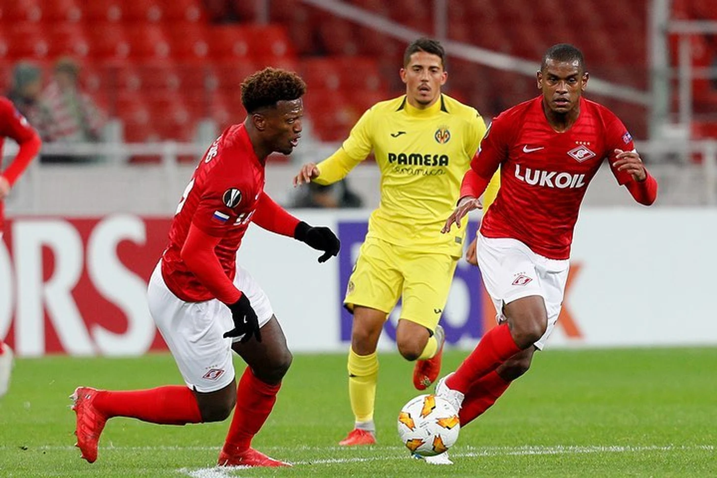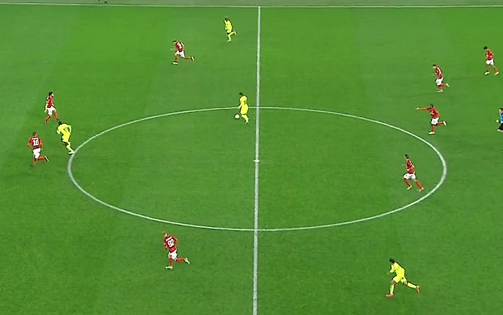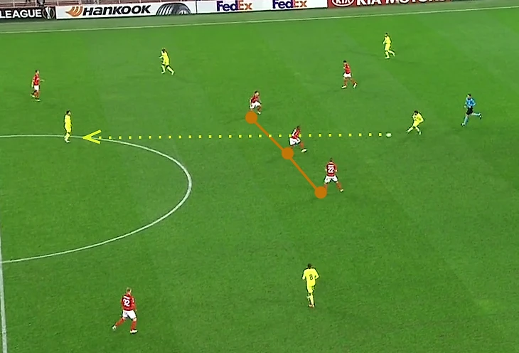 Возможность давить соперника высоким прессингом - одно из главных достоинств расстановки 4-3-3, о чём писал и Вадим Лукомский в упомянутой выше статье. Вот только с этим компонентом у Спартака всегда были проблемы, особенно в европейских матчах. Более того, часто это было настоящим бичом команды в еврокубках. Ниже можно увидеть пример из матча с Вильярреалом, где тройка полузащитников Спартака выдвигается в прессинг, оставляя огромное пространство за своей спиной.