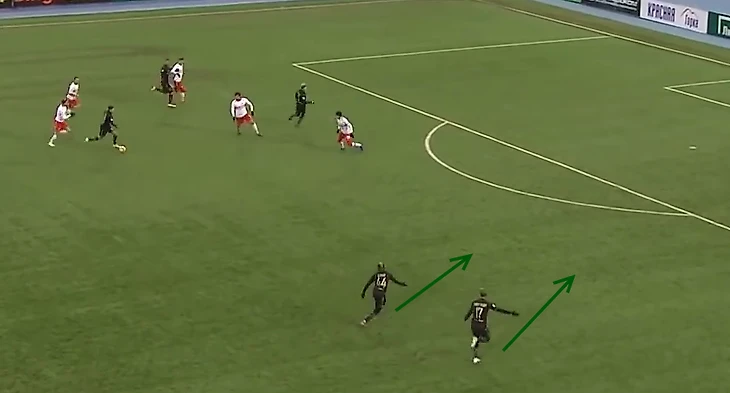 В атаке 4-3-3 хороша при быстрых и техничных краях, типа Промеса. Но у нас сейчас в составе таких нет. У Ташаева и Ломовицкого не получается обыгрывать защитников на скорости. Их прижимают к бровке, откуда остается только возвращать мяч через крайнего защитника в центр. Угроз чужим воротам минимум, а при ошибках с возвратом мяча обратно на ЦЗ сразу возникают крайне опасные контратаки. Еременко, Ханни и Попова отнести к крайкам вообще никак нельзя, это не их позиция.