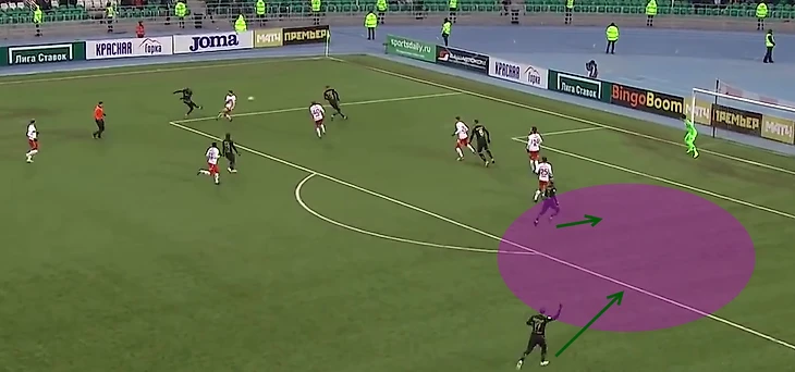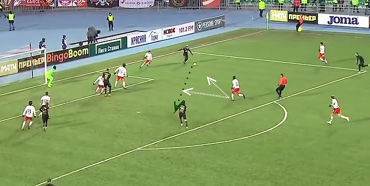 А когда проходит пас в это пространство, остаётся только махать руками, т.к. успеть за развивающейся атакой нет никакой возможности.