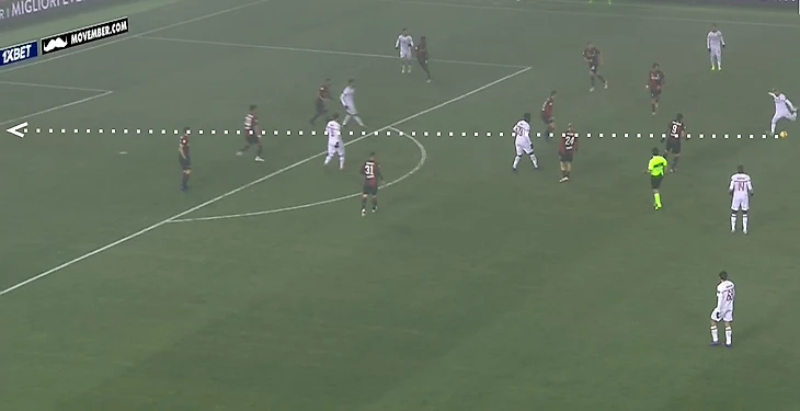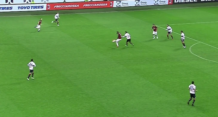 Как пример – матч с «Фиорентиной», перевод на Кастильехо. В данной ситуации рядом с игроком «Милана» уже есть защитник, и растянуть оборону не получится. Да и никакого численного преимущества у игроков «Милана» там нет. Плюс Кастильехо не очень-то просит этот пас. В общем, получается перевод ради перевода вместо того, чтобы попытаться разыграть комбинацию с партнерами.
