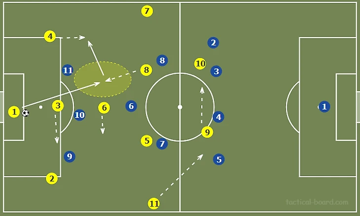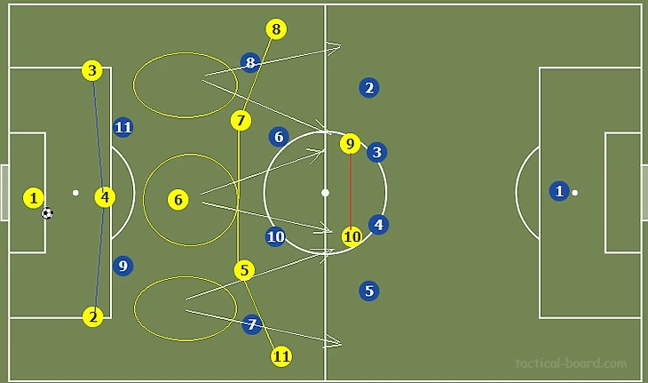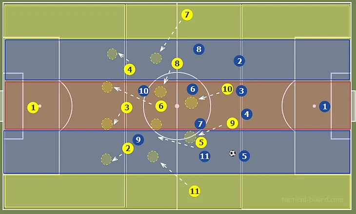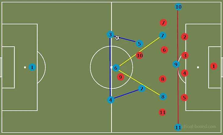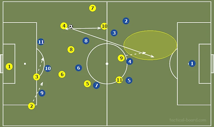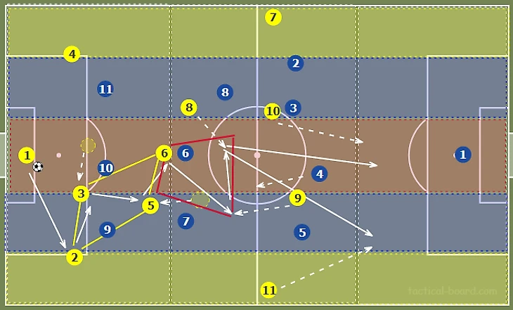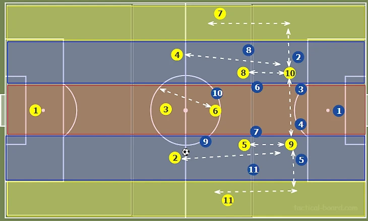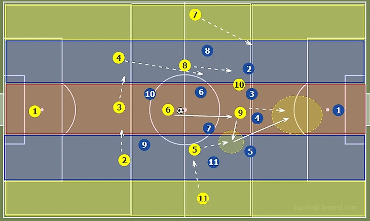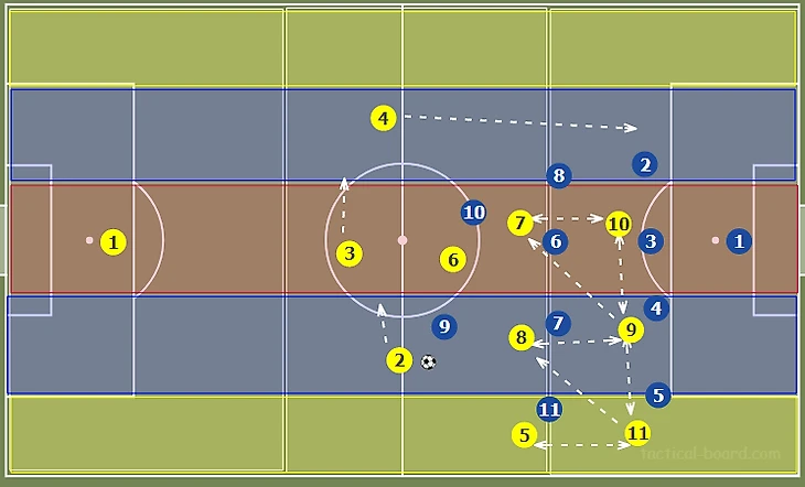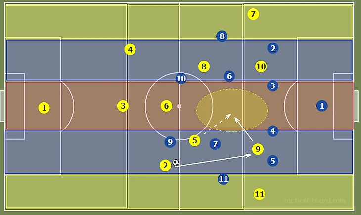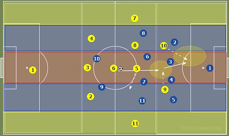 Стягивание соперников в полупространство и на фланг создает относительно более разряженное пространство в центре. Это позволяет путем игры на третьего продвинуть мяч в финальную треть через центр, что создает условия для диагональных, разрезающих передач вперед, в оба полуфланга. Также девятка может сыграть на подключившего с фланга №11.