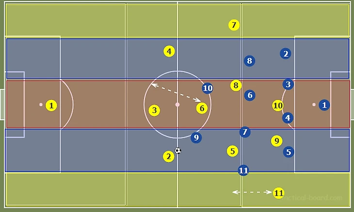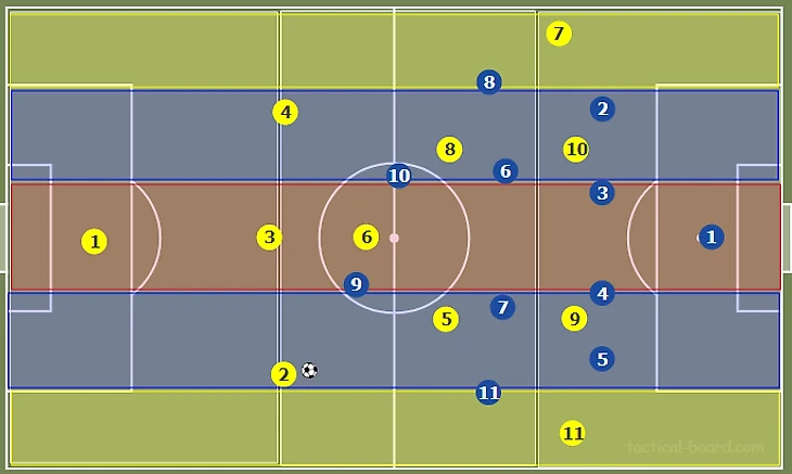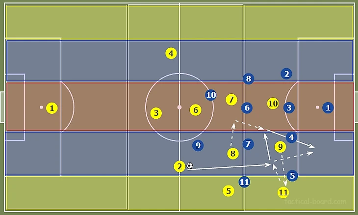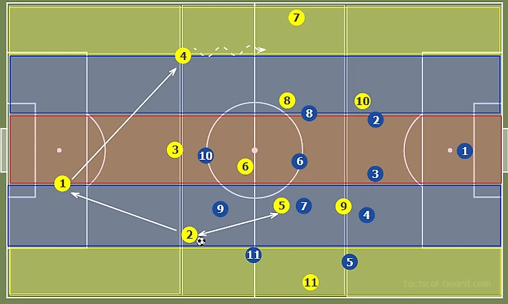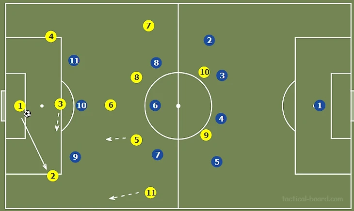 Внешний центральный защитник может продвигать мяч вперед, пока на него не будет оказано давление. В этот момент фланговый полузащитник (№11) смещается к бровке, предлагая вектор для передачи и одновременно растягивая оборону оппонентов.