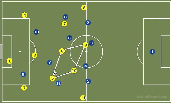 Важную роль в билд-апе играют внешние центральные защитники, которые в фазе игры без мяча автоматически становятся фулбеками. В момент передачи на двойку к нему начинают смещаться номера 3, 5 и 11. Аналогичная ситуация происходит и в случае, если передача следует на левого центрбека (3,8,7).
