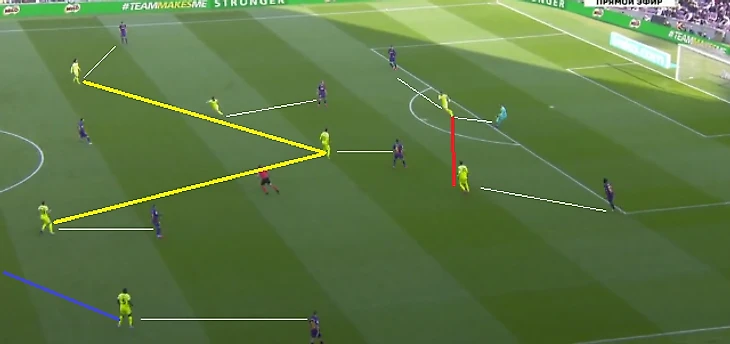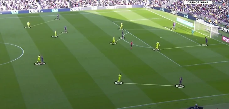 На схеме выше бросается в глаза асимметричность линий атаки и полузащиты. В аналогичной манере действовала «Барселона» Кике Сетьена в своих первых матчах при этом специалисте.