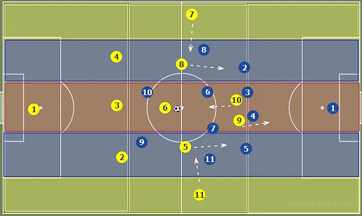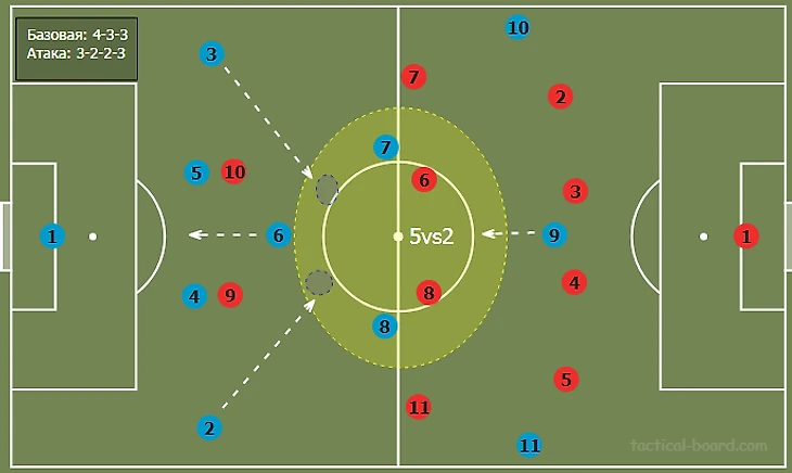 На места пятерки и восьмерки обязательно должны сместиться фланговые полузащитники. Они закроют важные зоны в полупространствах в случае потери мяча.