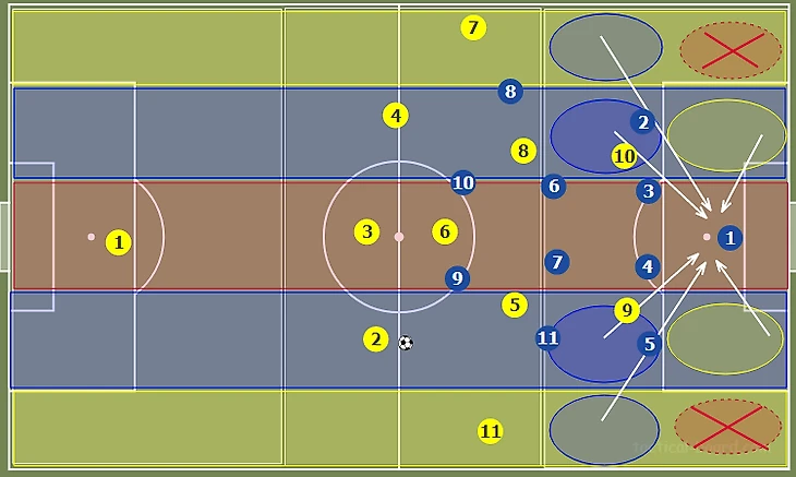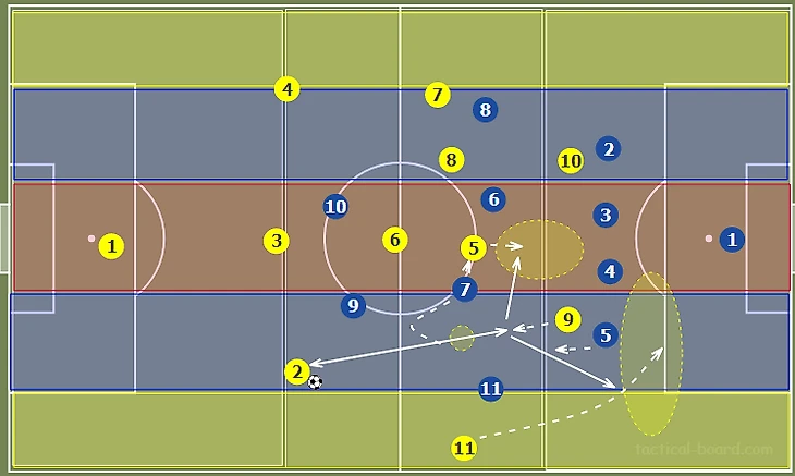 На схеме отмечены важнейшие зоны для продвижении мяча в начальной стадии позиционной атаки. При необходимости, в глубину могут опускаться полузащитники. Если соперник включает прессинг и держит высокую линию обороны, центрбеки имеют все условия к длинному забросу за спины защитникам. Но, наиболее эффективным результатом розыгрыша мяча будет его изначальное продвижение в отмеченные зоны.