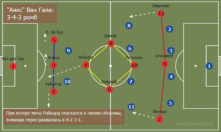 Размышления о новой роли фланговых защитников подтолкнули к воспоминаниям об «Аяксе» Луи ван Гала. Лучшая команды 90-х годов (на мой взгляд) уже тогда эффективно использовала гибридную схему- 4-2-3-1/3-4-3 ромб. В фазе игры с мячом команда играла 3-4-3 или 3-1-2-1-3.