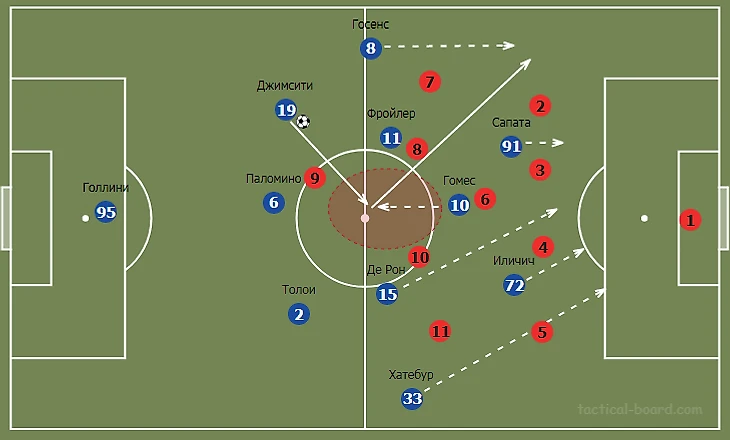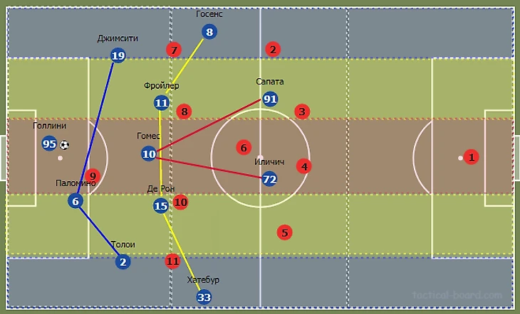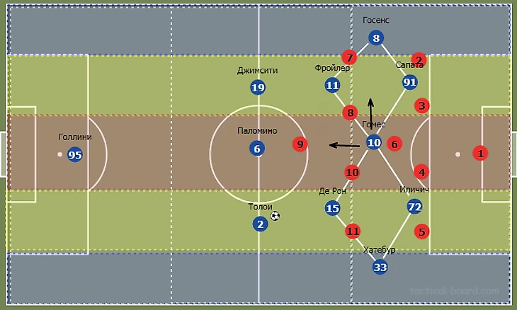 При билд-апе внешние центральные защитники расходятся к флангам, Паломино в штрафной смещается чуть правее, а Голлини на время розыгрыша мяча по сути становится левым центральным защитником, при игре в два центрбека. На границе первой и второй третей поля стягивают соперников центральные полузащитники. Между ними по вертикальному коридору в первую треть опускается "десятка" Гомес. На флангах, на одном уровне с полузащитниками открываются латерали.