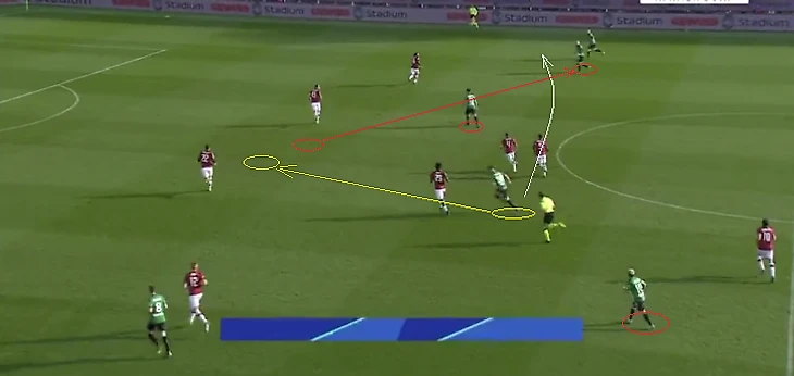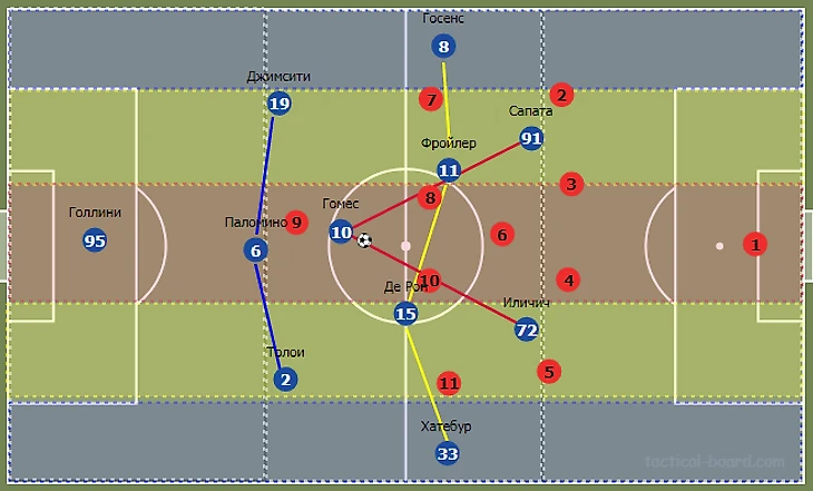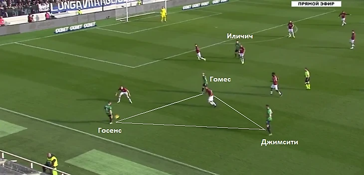 На скриншоте эпизода из матча "Аталанта" - "Милан" латераль (Госенс), левый центральный защитник (Джимсити) и левый инсайд (Гомес) при 3-4-2-1 "соорудили" классический фланговый треугольник.