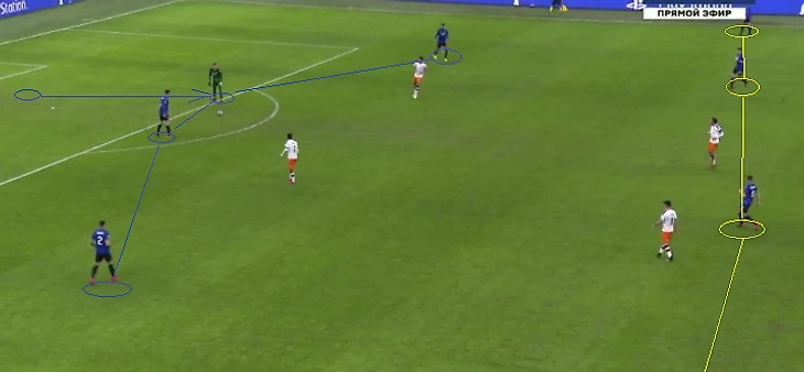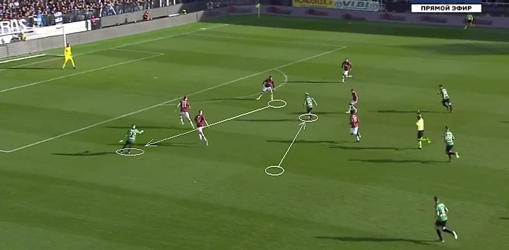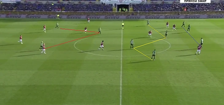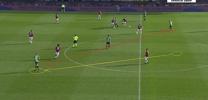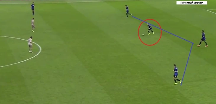 На данной стадии развития атаки хавбеки синхронно немного отдаляются друг от друга, расчищая зону в центре поля для Алехандро Гомеса. Десятка получает мяч, разворачивается лицом к воротам соперника и квалифицированно пользуется своим правом, задавая темп и направление развития атаки.