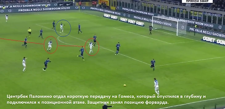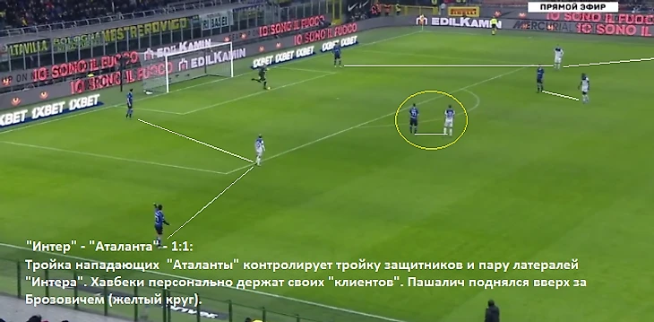 На скриншоте выше - эпизод из матча "Интер" - "Аталанта". Центральный защитник (синий) по ходу позиционной атаки оказался выше нападающих (красный).