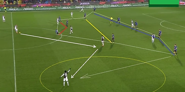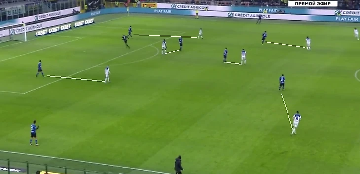 На скриншоте из матча с "Ювентусом" – позиционная оборона «Аталанты» низким блоком 5-2-1-2 или 5-2-3. Невооруженным взглядом видно, сколько свободного пространства остается на флангах до линии обороны. Но наличие пятерки защитников позволяет при необходимости фулбеку смело выдвигаться вперед для оказания давления на владеющего мячом соперника. За его спиной остается четверка защитников, чего при небольшом смещении достаточно, чтобы сохранялась компактность в линии и не возникали большие разрывы.