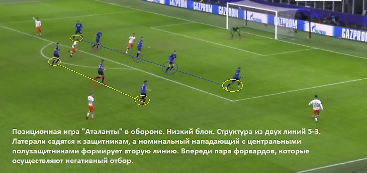"Аталанта" слишком заточена на персональный прессинг. Эта крайность приводит к тому, что в гораздо более распространенной и популярной позиционной, зональной обороне команда чувствует себя не комфортно. По большому счету, она не умеет обороняться по-другому. Даже при обороне низким блоком, мы наблюдаем, как правило – одну линию обороны и асимметрично расположенных игроков остальных линий, которые максимально агрессивно играют по своим непосредственным персональным ориентировкам.