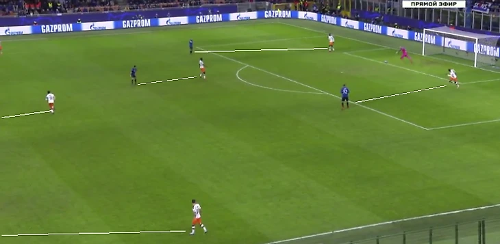 Чтобы накрыть высоким прессингом такой основательный билд-ап, необходимо шесть-семь игроков. Учитывая "гектары" свободного пространства на половине поля соперника "Аталанты" - столь агрессивная манера может привести к серьезным последствиям. Соперник рискует оказаться в ситуации, когда большая группа игроков будет обрезана одной-двумя передачами, а позиционная атака в начальной стадии автоматически трансформируется в быструю.