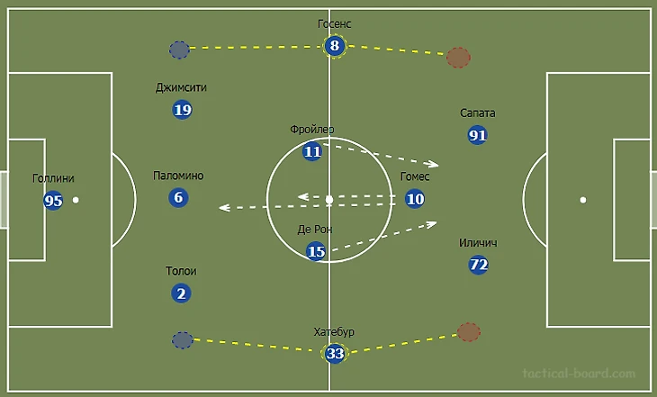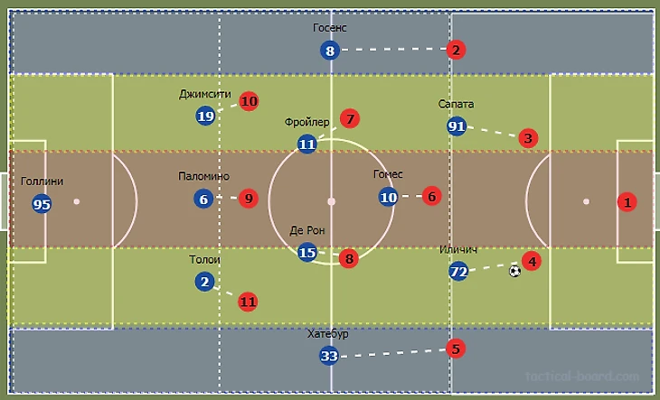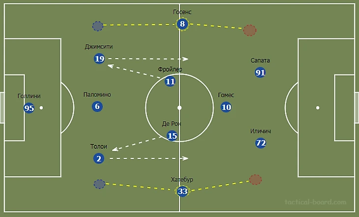 Регулярные смещения латералей и Гомеса делают схему 3-4-1-2 (или 3-4-2-1) условной. Она постоянно трансформируется. В ситуации, которая смоделирована на схеме выше, "Аталанта" временно перешла на 3-1-4-2, но эта формация проживет ровно до паса в исполнении капитана команды.