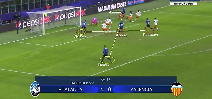 Аналогичный эпизод из матча 1/8 финала Лиги чемпионов с "Валенсией" (4:1). Нужно отметить, что игроки "Аталанты" умело меняются углами в этой геометрической фигуре. Комбинации в динамике значительно осложняют жизнь обороняющимся.