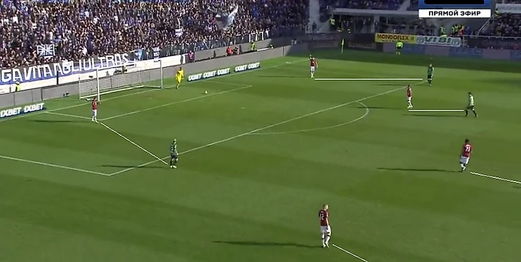 На скриншоте: защитники "Милана" озадачены, Гомес и Иличич меняются позициями, Малиновский находится глубже. Нелинейность и динамика позволяют "Аталанте" выигрывать в подобных эпизодах время. Порой даже дополнительные доли секунды позволяют выиграть эпизод.