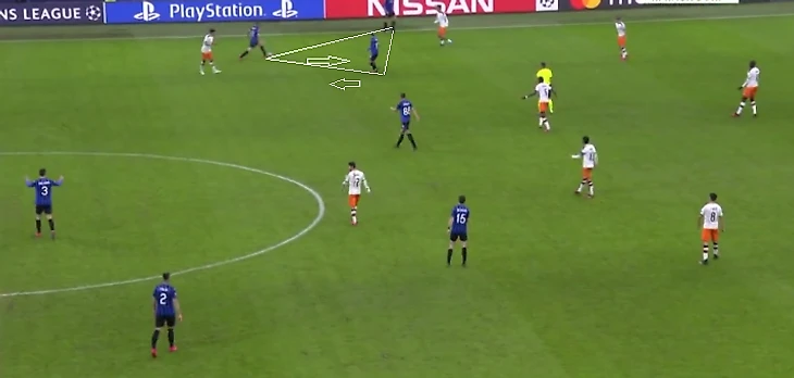 Если центрбек выдернулся из линии, запрессинговал оппонента, он также доигрывает эпизод до конца. На крайнем скриншоте правый центральный защитник Толои продвинул мяч во вторую треть поля, обыгрался с Гомесом и подал в штрафную.