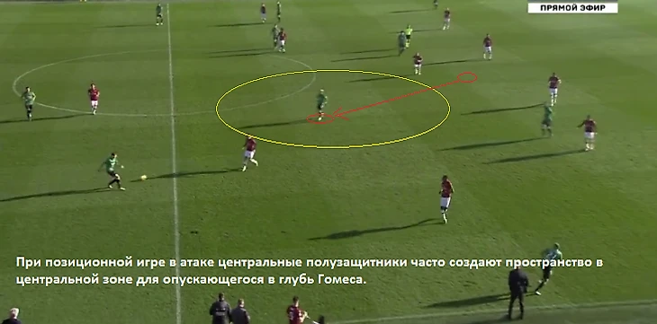 Когда Гомес опускается вглубь один из хавбеков поднимается в опорную зону соперника. Это важный момент для сохранения баланса в структуре.