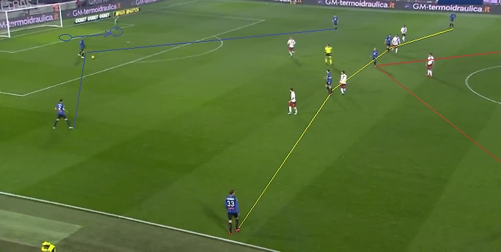 "Аталанты" переключается на опорника. Один фулбек соперника в данном случае остается свободным. Это лучше, чем выносить мяч в поле и оппоненты начинают организовывать позиционные атаки через этот единственный вариант. Это своего рода ловушка "Аталанты", которая захлопывается жестким персональным прессингом на фланге и в центре поля.