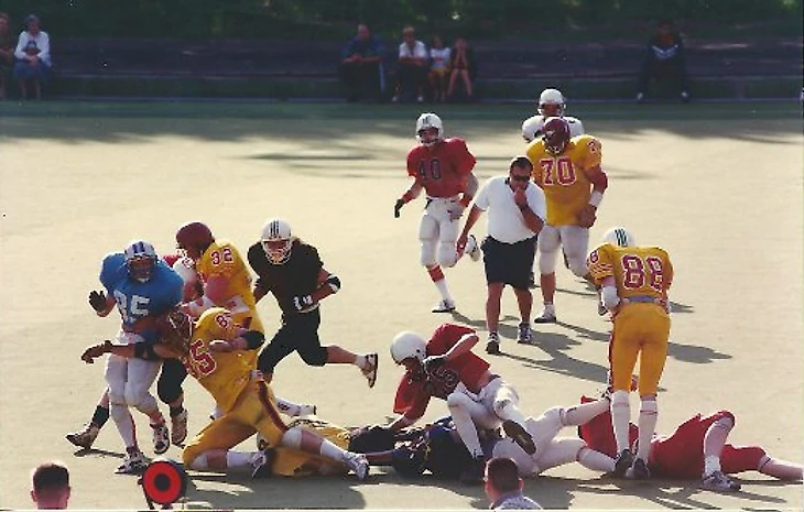 Как-то раз к нам на несколько дней приехал американский тренер из команды «Гамбург Блю Девилс». Пришел он в самом конце тренировки, когда мы уже уходили с поля. Так вышло, что стартовый центр основной команды на занятии отсутствовал. За мной прибежали в раздевалку взрослые ребята. Надели на меня шлем, каркас и позвали на поле. Помню, что вся защита была мне очень велика. Возможно, она была этого стартового центра. Я не думаю, что кто-то сейчас вообще на себя такую форму напялил бы. В смысле, такую большую. На тренировке все было очень печально. Американский тренер в какой-то момент подошел ко мне и прямо на голове развернул шлем сначала на 180 градусов, а потом и на 360. Затем похлопал меня по плечу и сказал что-то из серии «Будь осторожнее».