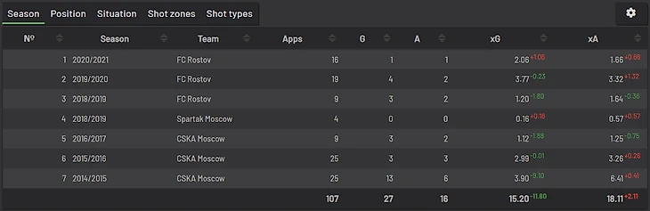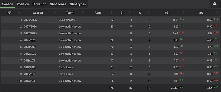 Бронза нашего топа неожиданно досталась Роману Еременко! Только посмотрите на эти цифры: 27 голов с лишь 15 xG за рассматриваемый период. Вот кто действительно недооценен фанатами РПЛ. Авторы Спортса даже не упомянули в топ-30 легионеров РПЛ за всю историю!