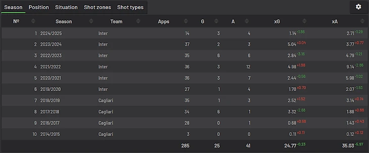 8 место занял полузащитник Интера Николо Барелла, поражающий стабильностью своей нестабильности. Посмотрите, как он чередует хорошие и плохие сезоны реализации: