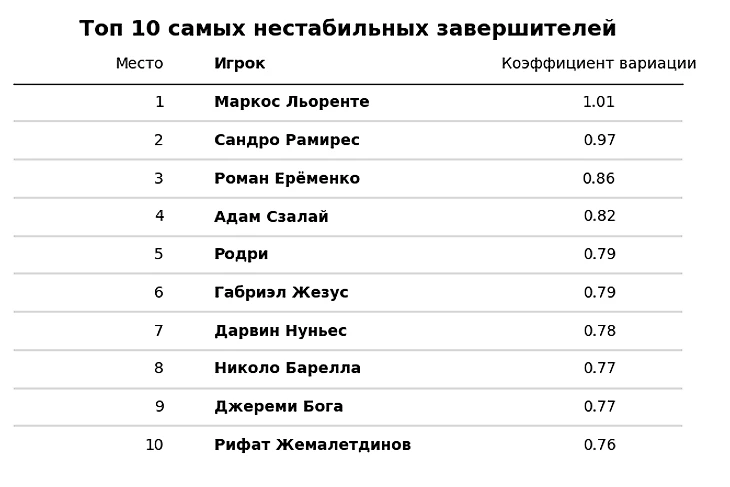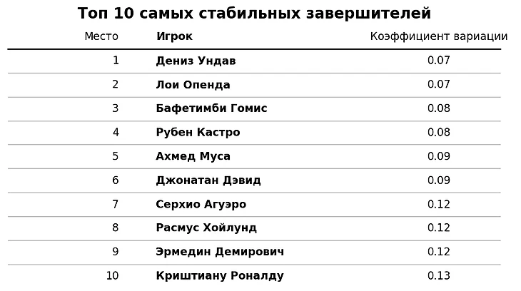 А самым стабильным бомбардиром Европы последних 10 лет по версии нашего блога стал Дениз Ундав. Учитывая, что его откопали скауты одного из сильнейших аналитических футбольных отделов Европы — Брайтона, позволю себе считать, что моя формула действительно оказалась достоверной. Отмечу также, что это уже второй представитель атаки Штутгарта в топе. Не уверен, случайность ли это. Если этот текст читает кто-то из штаба Штутгарта, дайте знать в комментариях.