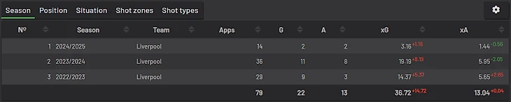 На 7 месте — любимчик всех фанатов АПЛ (не считая фанов Ливерпуля) Дарвин Нуньес. Если вы когда-либо вдруг сомневались насколько плоха его реализация, просто взгляните на цифры.