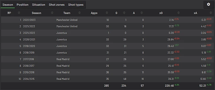 На 10 месте, к моему удивлению, оказался Криштиану Роналду. Хотя я не ожидал увидеть его в этом списке, так как он, кажется, стабильно реализует больше ожидаемого.