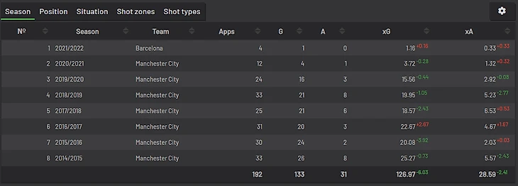 На 6 месте оказался Серхио Агуэро, стабильно реализовывавший свои моменты в Манчестер Сити. Период в Барсе также оказался благоприятным для нашего топа: там он забил 1 гол с xG 1.16