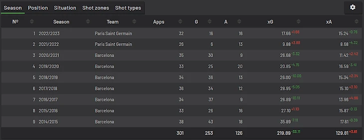 В связи с этим я задался вопросом: у кого в современном футболе самая стабильная (и нестабильная) реализация? Чтобы найти ответ, я обратился к сайту understat.com — базе данных продвинутой футбольной статистики по топ-6 топ-5 лигам и РПЛ — и применил пару простых формул из статистики. Understat ведет статистику начиная с сезона 2014/2015, поэтому будем рассматривать только этот временной отрезок.