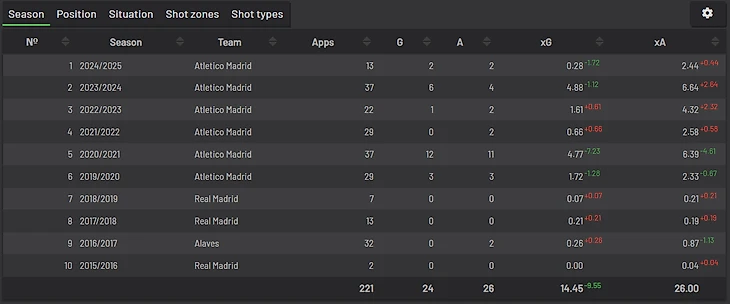 И, наконец, победитель нашего топа самых непостоянных бомбардиров Европы — Маркос Льоренте. Его показатель во многом обусловлен сезоном 20/21, где он забил 12 голов с 4 xG играя на высокой для себя позиции. После того сезона Диего Симеоне перестал использовать его так близко к воротам. Может быть, зря, Диего?