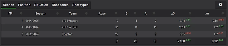 Босниец Демирович, который стабильно реализовывал во Фрайбурге и Аугсбурге, благодаря чему заслужил переход в Штутгарт, где на данный момент забил 7 голов при xG 7.06
