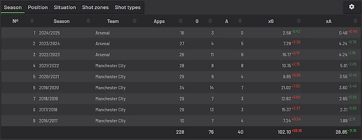Пятерку самых нестабильных бомбардиров открывает обладатель «Золотого мяча» Родри. В отличии от ранее упомянутых футболистов, он наоборот забивает значительно больше ожидаемого. Почему-то этот критерий его игры часто упускают в спорах о сильнейших футболистов мира.