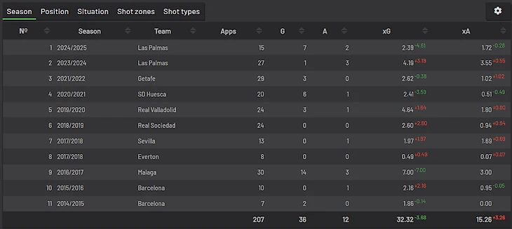 На 2 месте — Сандро Рамирес. Его реализацию, кажется, не понять никому. Шаманы, Астрологи, обращаюсь к вам за объяснением этого феномена. После сезона, где он забил 14 голов с 7 xG, он не мог забить больше двух лет! Однако, видимо, после открытия ретроградного Юпитера, тот самый Сандро Рамирес образца сезона 16/17 вернулся: 7 голов с 2 xG за Лас-Пальмас в текущем сезоне.