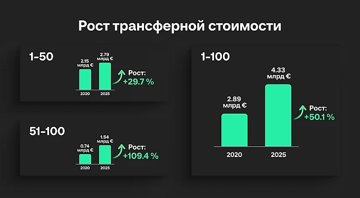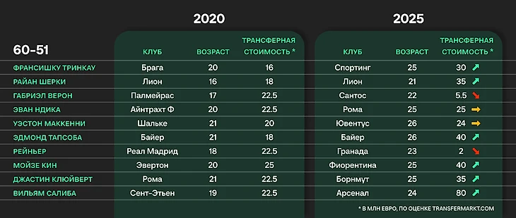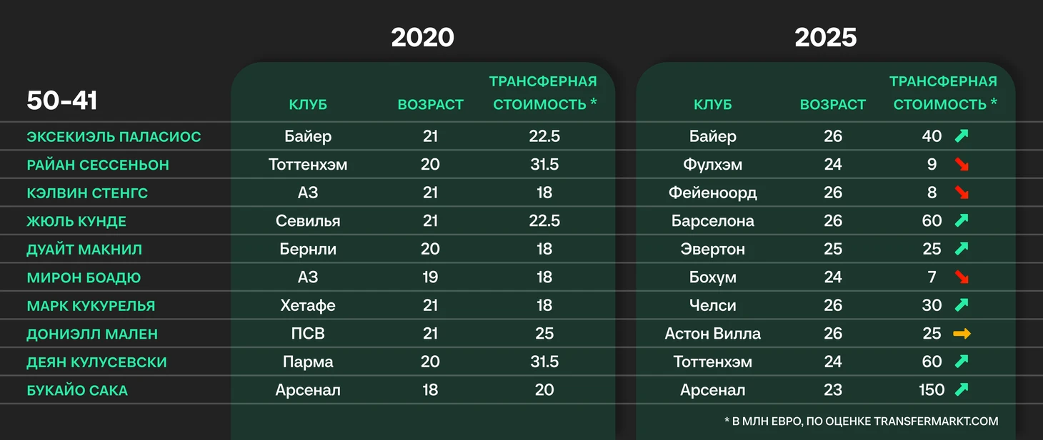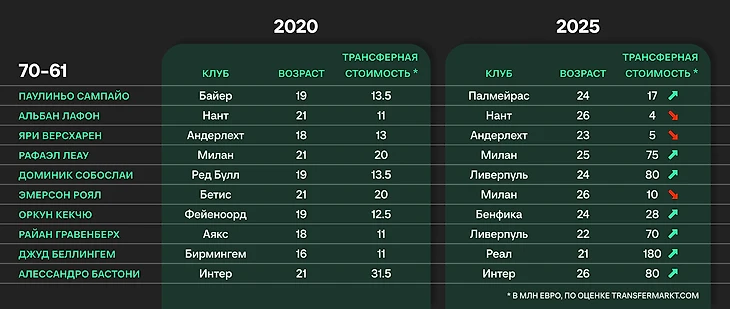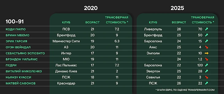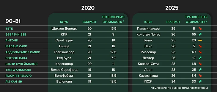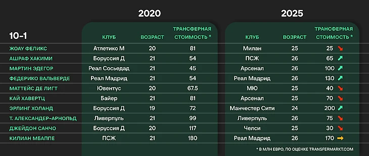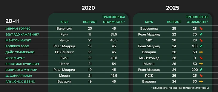 В 2020-м из представленных игроков по 5 играли за «Реал» и «Боруссию», четверо – за «Челси», в остальных клубах было по 3 и меньше. В 2025 году картина немного другая: на первом месте так же «Реал» с 6 игроками (причем их средний ценник уверенно переваливает за 100 млн евро), но сейчас королевский клуб делит первую строчку с «Арсеналом». В топ-5 – с 5 игроками каждый – «Ливерпуль», «Барселона» и... «Милан», собравший у себя в составе в основном не реализовавших потенциал.