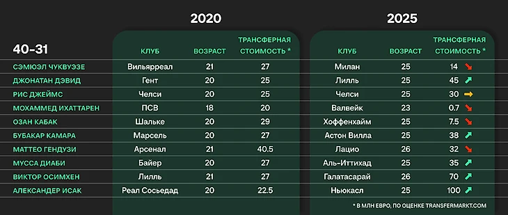 Крупнейший провал этого топа в абсолютной разнице между трансферной стоимостью в 2020 и 2025 годах – Джейдон Санчо. Путь от восьмого самого дорогого футболиста мира до игрока, за избавление от которого «Челси» хочет заплатить «МЮ» 8 млн евро, англичанин прошел всего за 5 лет. Еще в 2020-м Евгений предупреждал Джейдона о потенциальных проблемах с адаптацией в АПЛ и был абсолютно прав.
