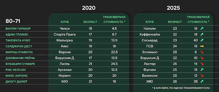 Довольно посредственная десятка в плане развития карьер этих талантов. Лишь Такефуса Кубо и Диогу Далот сейчас оцениваются в более чем 20 млн евро.