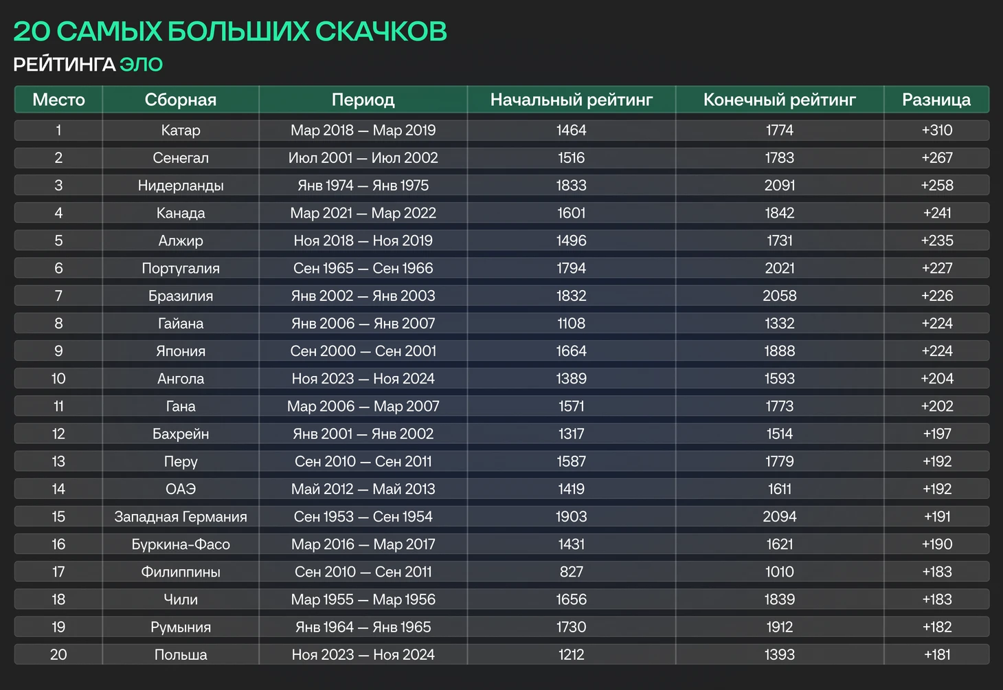 Рядом с Катаром в топе расположилась сборная Сенегала, выстрелившая на ЧМ-2002, где им едва не хватило до выхода в полуфинал, а также Голландия Йохана Кройффа, проигравшая в финале ЧМ-1974.