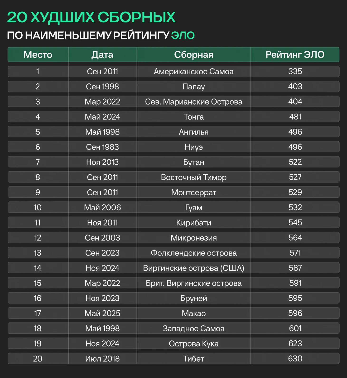 Среди любопытных фактов стоит отметить 16-е место недавних соперников сборной России – Брунея. Причем их худшая версия была совсем недавно – в 2023 году, после поражения от сборной Гонконга со счетом 0:10.