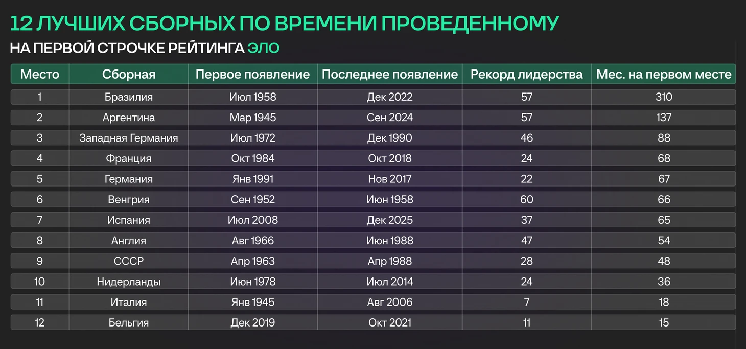 Финалисты последнего ЧМ – Франция – на четвертом месте, а пятерку замыкает сборная Венгрии, доминировавшая в 1950-х. Восьмое место СССР вызывает уважение – советская команда была на вершине дольше, чем Италия и Бельгия вместе взятые.