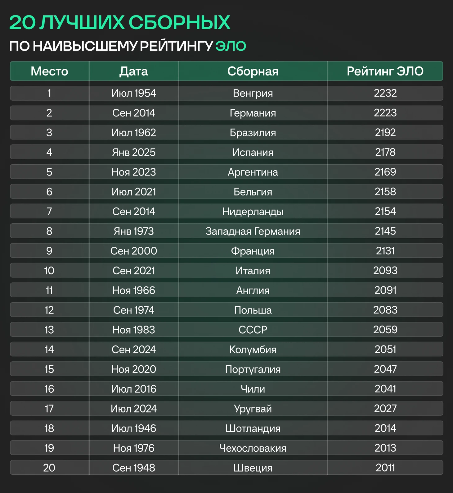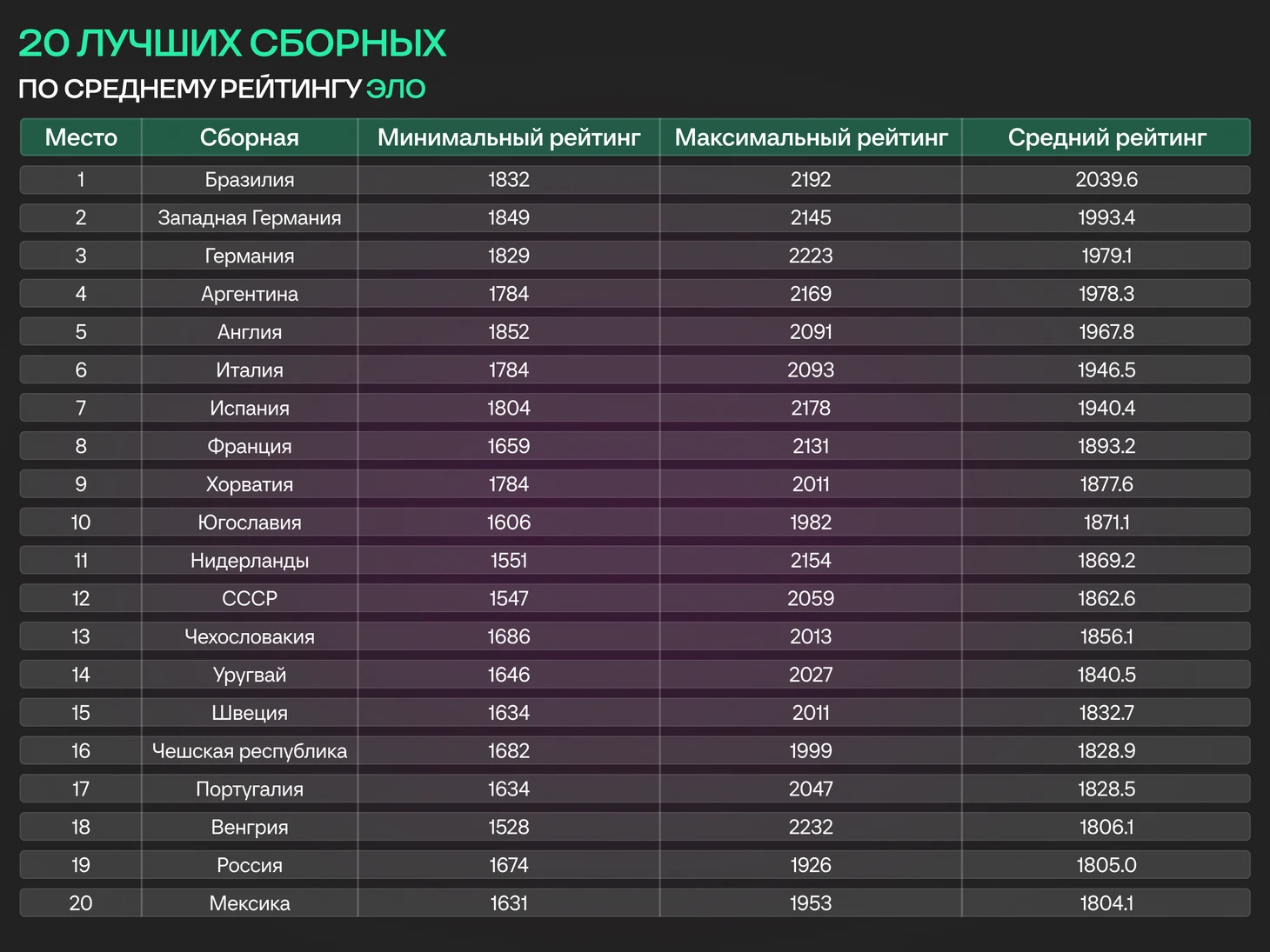 По среднему рейтингу ЭЛО в истории со значительным отрывом лидирует Бразилия. К слову, четверть стран, представленных в этом рейтинге, уже не существует, включая вторую команду в истории – ФРГ.