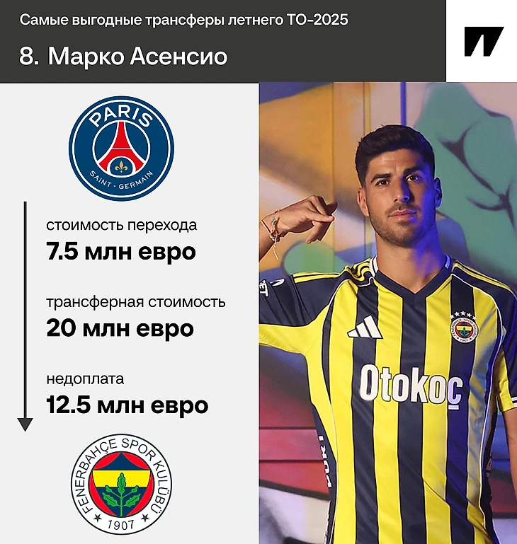 «ПСЖ» – единственный клуб в топе с двумя невыгодными продажами. Действующие победители ЛЧ смогли, хоть и за небольшие деньги, продать двух испанцев и освободить зарплатную ведомость. Вряд ли клуб будет сожалеть об этих уходах. За пять лет, в сумме проведенных в Париже, Солер и Асенсио забили 9 голов и отдали 9 голевых передач.
