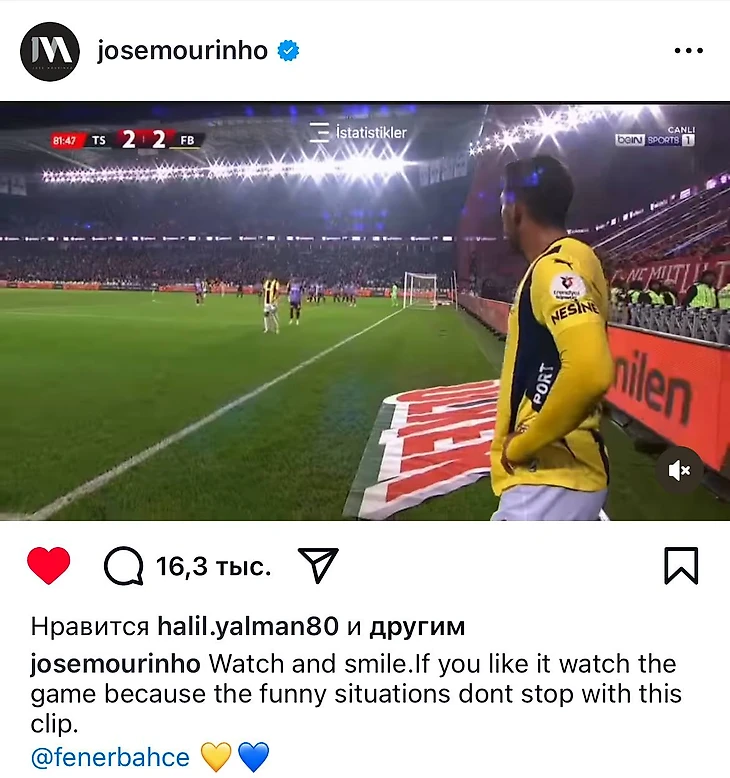 «Самый большой скандал в матче — пенальти, назначенный не в нашу пользу. Я выложу этот эпизод в Instagram*. Более пяти миллионов человек посмотрят на этот пост и увидят, что такое турецкая лига», — и Жозе не обманул: он действительно выложил эпизод с не назначенным в пользу «Фенербахче» пенальти и сопроводил его следующим описанием: «Смотрите и улыбайтесь. Если вам понравилось, посмотрите игру полностью, потому что забавные эпизоды не ограничиваются лишь этим». И его действительно посмотрело более пяти млн человек (семь с половиной).