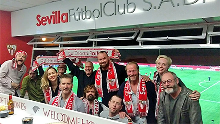 Канал HBO продолжает снимать эпизоды для нового сезона популярного сериала «Игра престолов». Актеры, которые находятся на съемке в Севилье, нашли время и для футбола. Матч «Севилья» – «Барселона» пришли посмотреть Эмилия Кларк (Дейенерис Таргариен), Питер Динклэйдж (Тирион Ланнистер), Николай Костер-Вальдау (Джейме Ланнистер) и другие актеры.