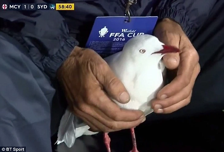 Раненая чайка тут же упала. Вратарь Дэнни Вукович подбежал к ней, взял ее в руки, добежал до боковой линии и аккуратно положил птицу за пределами поля.