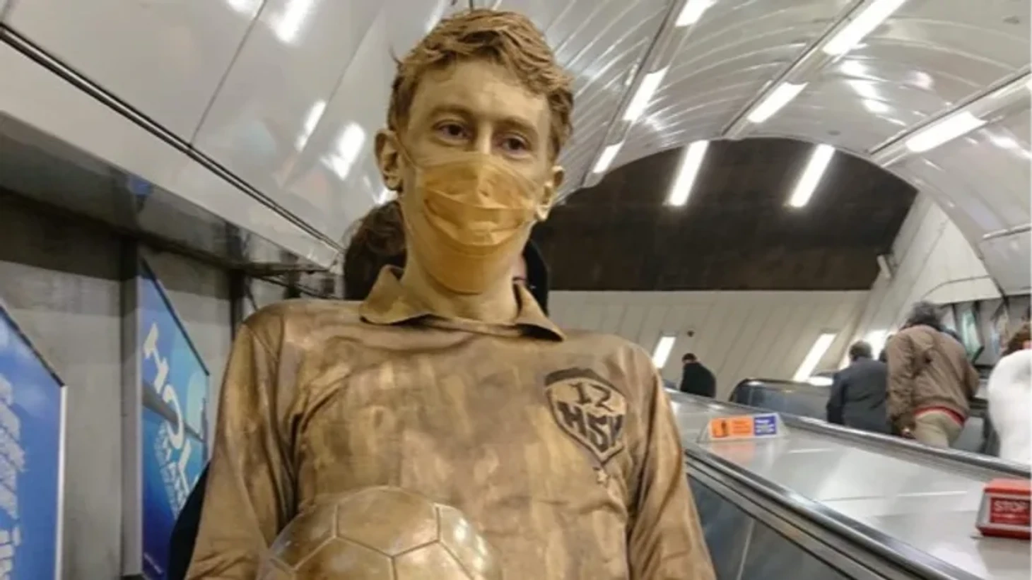 Талбот на пару часов превратился в памятник «fantasy-лузеру». Молодого человека выкрасили золотой краской, дали золотой мяч и надели золотую форму. Получилась живая статуя.